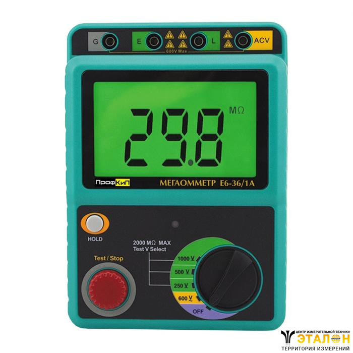 Мегаомметр ПрофКиП Е6-36/1А измеряет сопротивление изоляции в диапазоне от 1 кОм до 2000 МОм. Измеритель сопротивления изоляции позволяет производить измерение напряжением от 250 В до 1000 В, которое разбито на 3 фиксированных режима. Помимо сопротивления, прибор позволяет измерять напряжение электрической цепи до 600В. Тестер изоляции ПрофКиП Е6-36/1А при измерении выводит показания на ЖК-дисплей, оснащенный подсветкой.