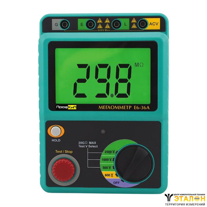 Мегаомметр ПрофКиП Е6-36А измеряет сопротивление изоляции в диапазоне от 1 кОм до 20 ГОм. Измеритель сопротивления изоляции позволяет производить измерение напряжением от 500 В до 2500 В, которое разбито на 3 фиксированных режима. Помимо сопротивления, прибор позволяет измерять напряжение электрической цепи до 600В. Тестер изоляции ПрофКиП Е6-36А при измерении выводит показания на ЖК-дисплей, оснащенный подсветкой.