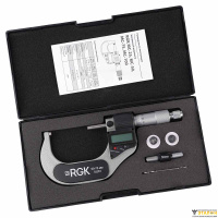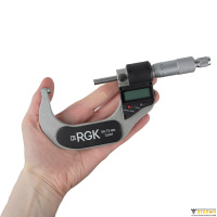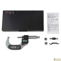 Электронный микрометр RGK MC-75 снабжен не только цифровым, но и обычным механическим отсчетным приспособлением со шкалами на стебле и барабане, обеспечивая возможность выполнения измерений наружных размеров в диапазоне от 50 до 75 мм. Изделие оборудуется скобой с внутренним вырезом шириной 81 мм и глубиной 45 мм относительно оси 6,5-миллиметрового шпинделя микрометрического винта. Прибор поставляется в жестком футляре, с калиброванной 50-миллиметровой установочной мерой и специальным ключом для перенастройки начального положения механического отсчетного устройства.