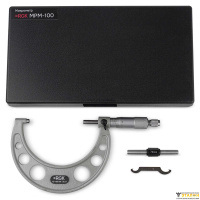 Механический микрометр RGK MPM-100 характеризуется высокой надежностью и низкой эксплуатационной стоимостью, так как не нуждается в периодической замене батарей питания. Твердосплавные напайки предохраняют измерительные поверхности от изменения формы вследствие абразивного износа при контакте с объектами из прочных материалов. Наличие полуповоротого фиксатора вылета микрометрического винта исключает случайное изменение расстояния между измерительными плоскостями после замера при считывании показаний. Пользователь может самостоятельно проверить точность установки начального положения измерителя с помощью комплектной концевой меры с калиброванной длиной 75 мм, а также произвести перенастройку микрометра RGK MPM-100, используя специальный ключ, поставляемый с прибором.