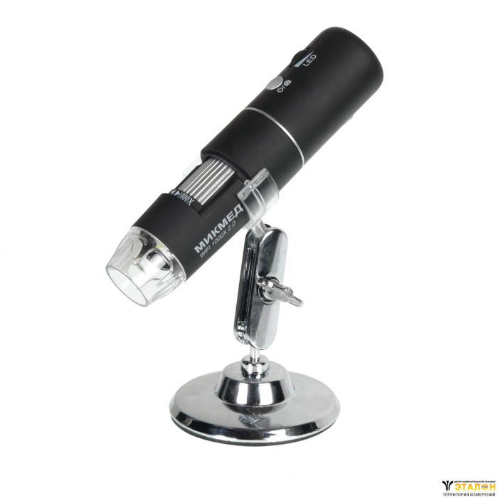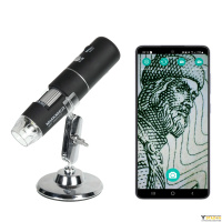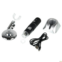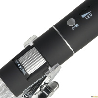 Цифровой микроскоп с камерой 2.0 MP, увеличением до 1000х. Источник света: 8 светодиодов с регулировкой яркости. Подключение по USB к ПК, по WiFi к смартфонам c APP (Android/IOS). Возможность записи фото и видео. Хромированный штатив с бесступенчатой регулировкой положения.