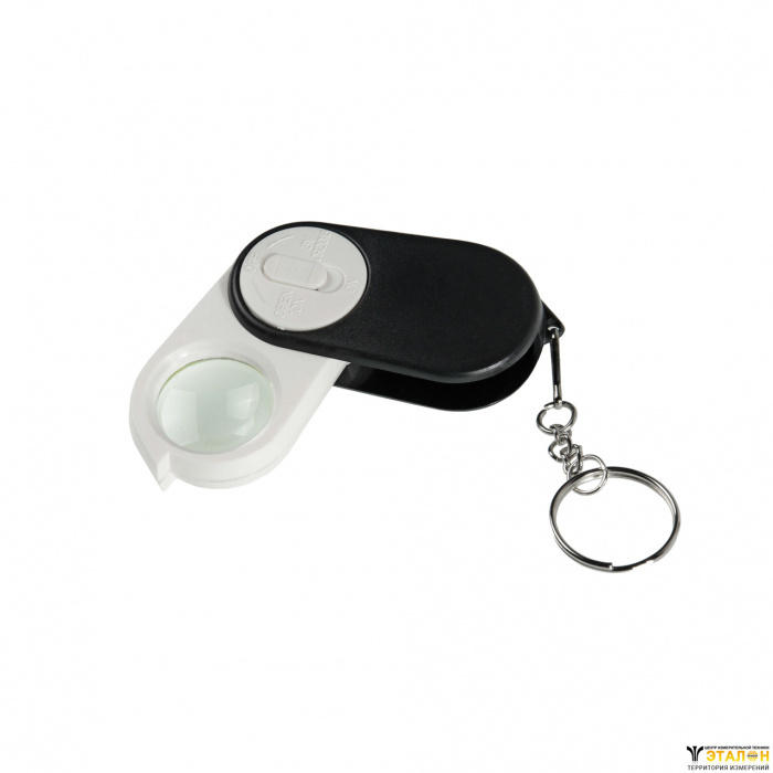 Складная лупа-брелок Veber с 10-кратной линзой (диаметр 23 мм) и со светодиодной подсветкой. Питание подсветки осуществляется от двух элементов CR2016 или одного элемента типа 2032 (идут в комплекте).