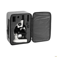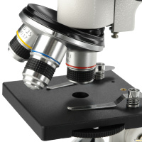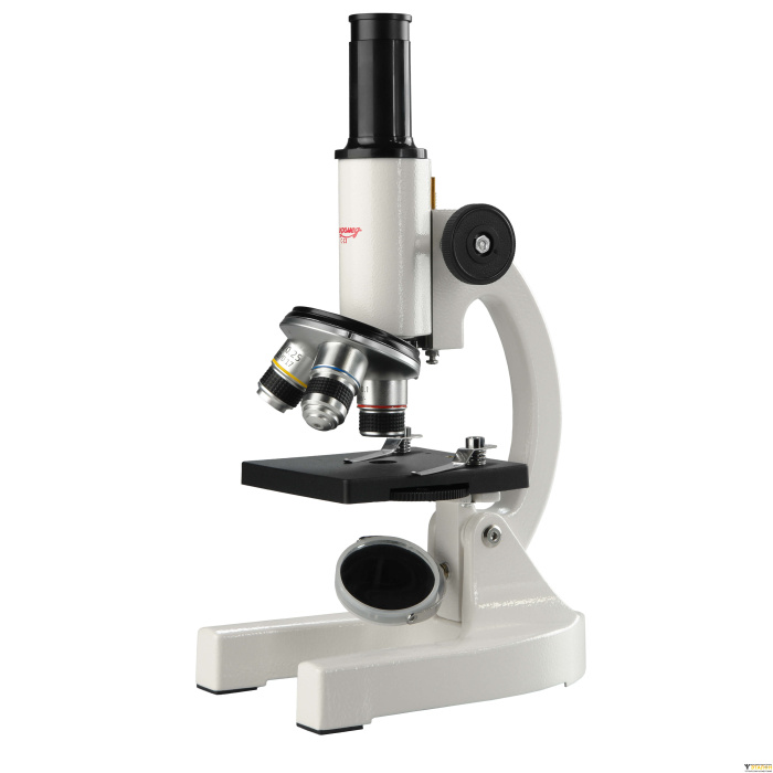 Монокулярный микроскоп. 3х позиционный револьвер объективов. В комплекте 3 ахроматических объектива и 2 окуляра. Увеличение до 800х. Освещение - зеркало с двумя отражающими поверхностями. Грубая фокусировка. Кейс в комплекте.
