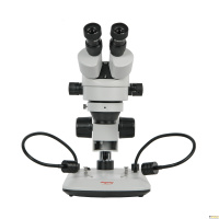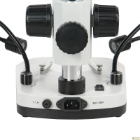 Стереомикроскоп с переменным увеличением от 7х до 45х. Увеличенное рабочее расстояние 100 мм. Светодиодный осветитель проходящего света и два осветителя отраженного света на гибких держателях. Мультивольтажное питание микроскопа 90 – 240 В.