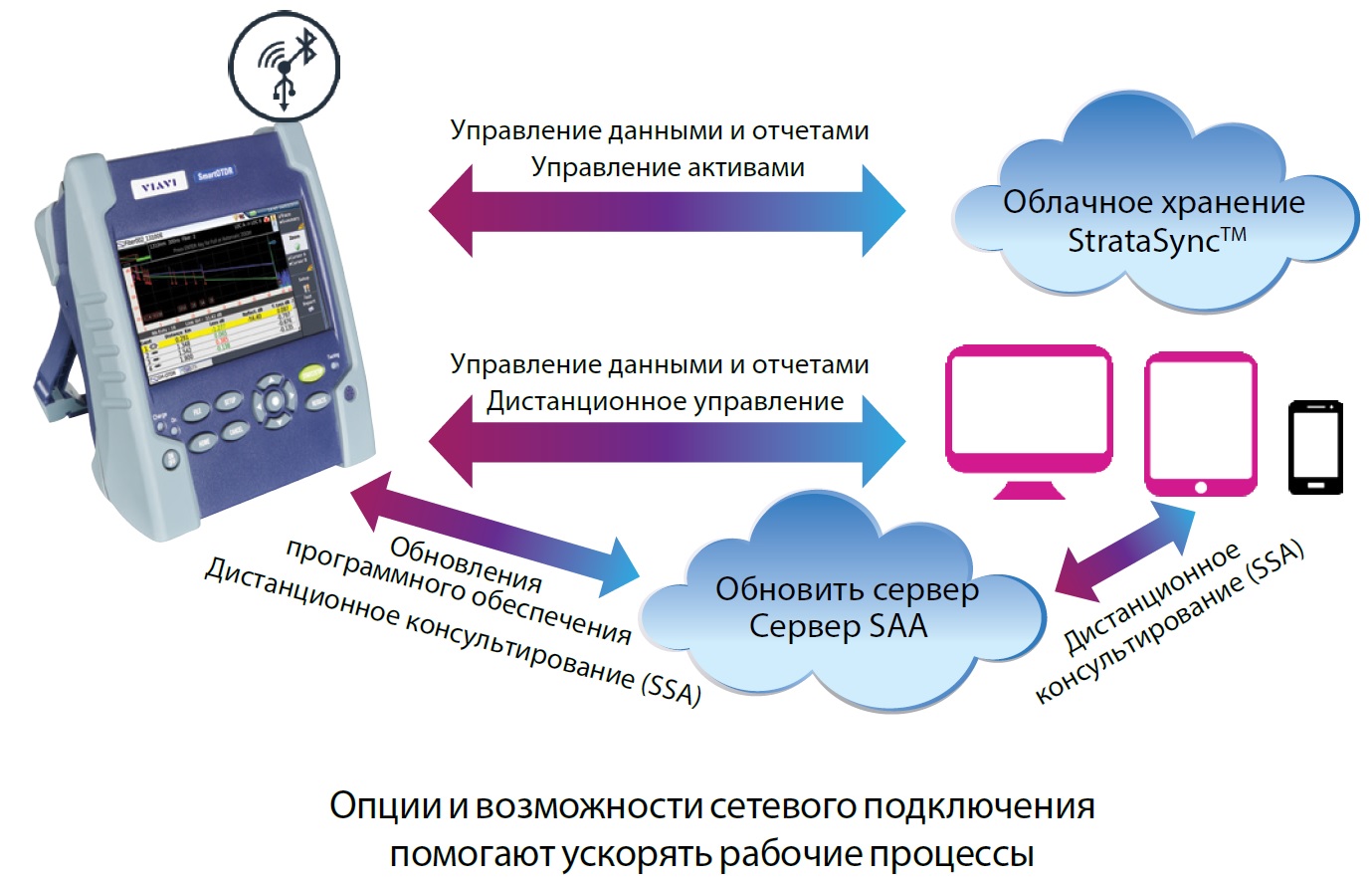 Несколько вариантов подключения (смартфоны 3G/4G по USB и дополнительно по Bluetooth/WiFi) обеспечивают возможность дистанционного контроля и передачи данных/заданий и обмена данными с планшетами, смартфонами и компьютерами. SmartOTDR позволяет оперативно решать проблемы в режиме реального времени, а опция SmartAccess Anywhere (SAA) открывает подключение к облачному сервису, помогая техническому специалисту получать дистанционный доступ к инструменту и управлять им. Решение SmartOTDR совместимо с большим количеством облачных серверов (поставщики услуг WebDAV), что позволяет мгновенно обмениваться отчетами об измерениях с помощью функции создания отчетов в формате .pdf — FastReport. Для опции SAA прибор должен иметь оптический адаптер SC.