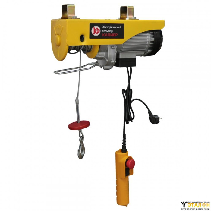 Электрический тельфер Калибр ЭТФ-500А подвесной грузоподъёмный механизм, предназначенный для вертикального поднятия/опускания различных грузов в бытовых условиях. Основание тельфера крепится на балке (консоли) над местом проведения работ. В основании закреплены: двигатель, шестерёнчатый редуктор и барабан. Стальной многожильный трос, намотанный на барабан, и закреплённый на конце троса крюк (или полиспаст), являются основным рабочим инструментом тельфера. Управление подъёмом и опусканием груза осуществляется с подвесного пульта. Для экстренной остановки двигателя на пульте смонтирована кнопка аварийного отключения красного цвета.