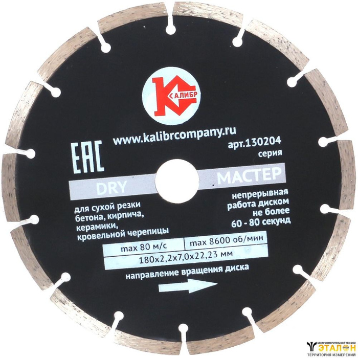 Диск алмазный "Калибр-Dry" 180х22мм (арт.130104) предназначен для машин шлифовальных угловых.