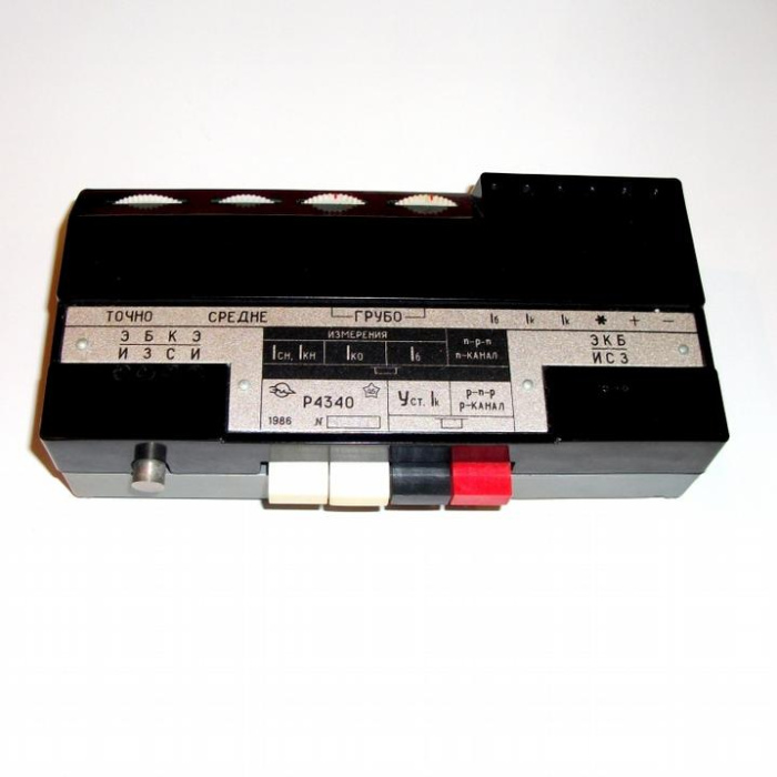 Приставка Р4340 для определения параметров полупроводниковых приборов предназначена для измерения параметров биполярных транзисторов типа p-n-p и n-p-n в схеме с общим эмиттером, униполярных (полевых) транзисторов, униполярных (полевых), транзисторов с p и n-каналом в схеме с общим истоком и других полупроводниковых приборов с p-n-переходами при использовании в качестве отсчетного устройства любого электроизмерительного прибора, имеющего пределы измерения постоянного тока и напряжения