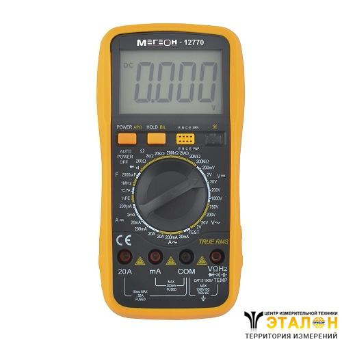 Компактный и надежный цифровой мультиметр МЕГЕОН 12770 предназначен для измерения переменного и постоянного напряжения, измерения переменного и постоянного тока, сопротивления, емкости конденсаторов, температуры, а также проверки диодов и прозвонки соединений. Для улучшения считывания показаний прибор оснащен жидкокристаллическим дисплеем 3½ разряда с автоматической индикацией полярности. Мультиметр МЕГЕОН 12770 имеет защиту от перегрузки, индикатор разряженной батареи и функцию удержания показаний. Противоударный холстер и откидная подставка-упор на задней панели прибора делают его эксплуатацию более удобной. Мультиметр МЕГЕОН 12770 идеально подходит для работ в полевых условиях, лабораториях, на производстве и дома в быту.