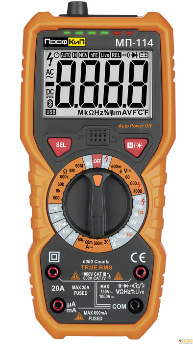 | Мультиметры переносные ПрофКиП МП-114 предназначены для измерения напряжения постоянного и переменного тока, силы постоянного и переменного тока, сопротивления постоянному току, электрической ёмкости и частоты. Мультиметры отличает компактность, незначительная масса и возможность автономного питания в различных условиях эксплуатации. Мультиметры предназначены для использования в цеховых и лабораторных условиях, при наладке и ремонте радиотехнического оборудования, электронных схем и узлов автоматики, а также при тестировании и ремонте промышленных электросетей. Портативные цифровые мультиметры ПрофКиП МП-114 позволяют измерять значения и переменного и постоянного напряжения и тока, сопротивления, частоты и температуры, с возможностью измерения среднеквадратичных значений. Также имеется имеется функция защиты от перегрузки и индикации разряженной батареи | ||||