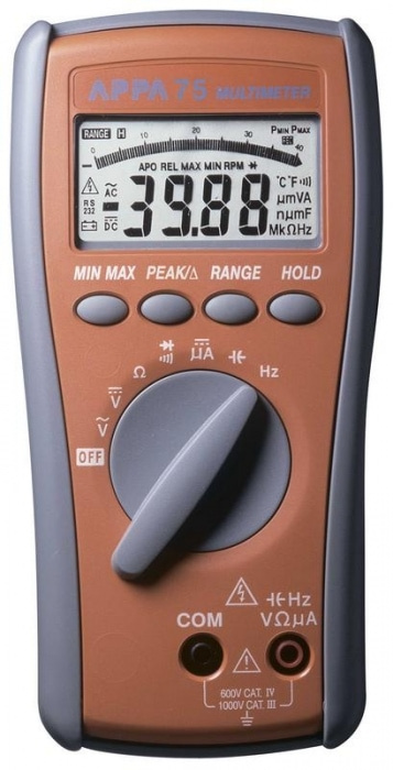 U пост. 0,4…1000В (погрешность ± 0,5 % (базовая)), U пер. 0,4…750 В (50 Гц-500 Гц), I пост 0,1…4000 мкА, R 0,1 Ом…40 МОм (разрешение 0,1 Ом), емкость 4 нФ…4 мФ (1 пФ), прозвон цепи (до 30 Ом) и проверка диодов, частота 4 кГц-40 МГц, удержание параметров, удержание пиковых значений, мин/макс, REL измерения, графическая линейная шкала, дисплей 4 разяда (4000), питание 2 Х1,5 В, автоотключение, противоударное исполнение (до 1,2 м), масса 350 г.