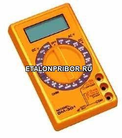 Цифровой мультиметр DM-301: измерение в частотном диапазоне 40 ... 400 Гц: постоянного напряжения 100 мкВ ... 1000 В, переменного напряжения 100 мВ ... 750 В, постоянного тока 0,1 мкА ... 10 А, сопротивления 100 мОм ... 2 МОм, P-N Тест; базовая погрешность 0,7%; дополнительные функции: ЖКИ 3 1/2; питание 9 В (1х9 В), габариты 128х75х24 мм, масса 270 г.