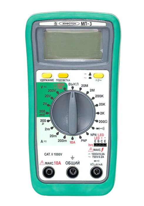МП-3 ручной мультиметр используют для измерения постоянного и переменного тока и напряжения, а также сопротивления, частоты, емкости и температуры.