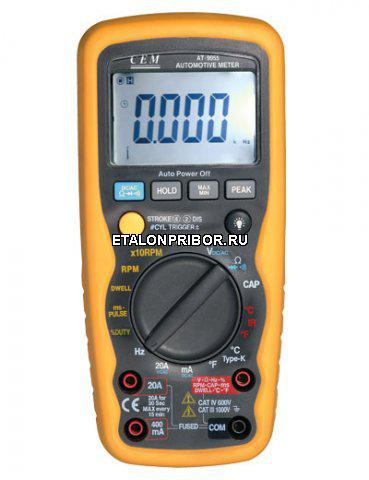 Измерение количества оборотов в минуту от 2 до 10 цилиндров. Большой жидкокристаллический дисплей с подсветкой 14 функций: постоянное/переменное напряжение, постоянный/переменный ток, сопротивление, число оборотов в минуту, угол замкнутого состояния, рабочий цикл, частота, температура окружающей среды, пирометр, емкость, прозвонка и тест диодов. Считывание пульсации цикла угла зажигания и угла для электронного впрыскивания топлива в двигатель. Удержание текущего показания и относительные измерения. Индикация перегрузки. Измерение ширины пульсации в миллисекундах времени включения впрыскивания воздушно-топливной смеси в инжекторный двигатель. Выносной пирометр, для бесконтактного определения температуры в труднодоступных местах. Автовыключение.