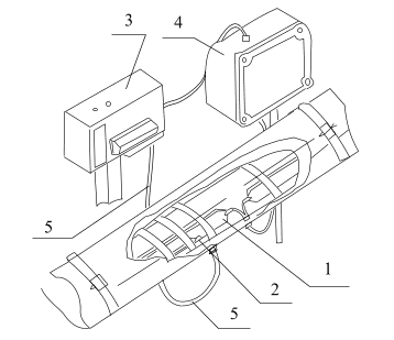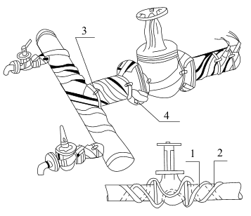Монтаж нагревателей на отпускном коллекторе резервуара: 1,2 - Нагреватели, 3 - Стеклолента, 4 - Алюминиевая лента