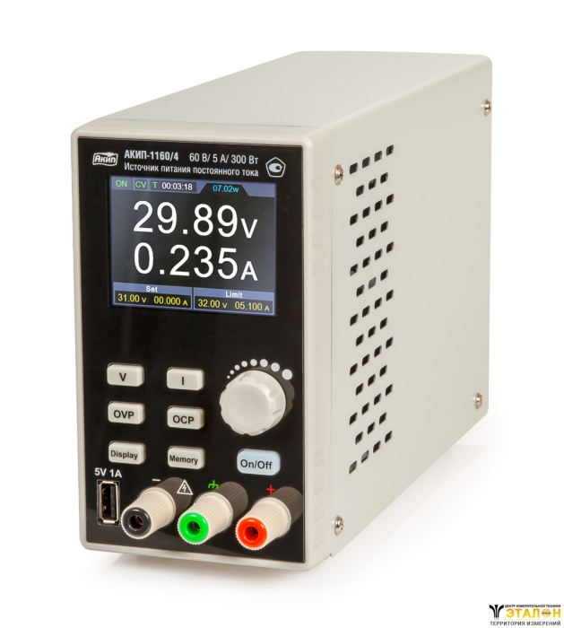 | Особенности | ВАХ непрямоугольная (мультидиапазонное исполнение, ВАХ определяет фиксированное значение Pвых). Число выходов - 1 рег. канал + 1 фиксир. для питания USB-устройств (5В/1А). Макс. разрешение установки и измерения 10 мВ/ 1 мА. Режим стабилизации тока (СС) и напряжения (CV). Погрешность установки U/I ±0.1% (базовая). Внутр. память 4 профиля настроек, цветной 4-х разр. графический дисплей (диаг. 7 см). Функция построения графика Uвых, звуковой сигнал предупреждения. Отключаемый выход с функцией отложенного включения (5с). Одновременное отображение тока, напряжения и Pвых. Защита от перегрузки по току (OCP), от перенапряжения (OVP). Компактность, малый вес (1,5кг) |