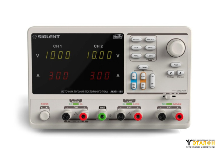| Особенности | Дискретность индикации 10 мВ, 10 мА. Нестабильность от 0,01 %, пульсации 300 мкВ ср. кв., 3 мА ср. кв. Графический Светодиодный (LED) индикатор. Встроенная память (5 ячеек) для сохранения/вызова профиля настроек. Индивидуальные клавиши электронного отключения выхода. Функция блокировки кнопок на передней панели. |