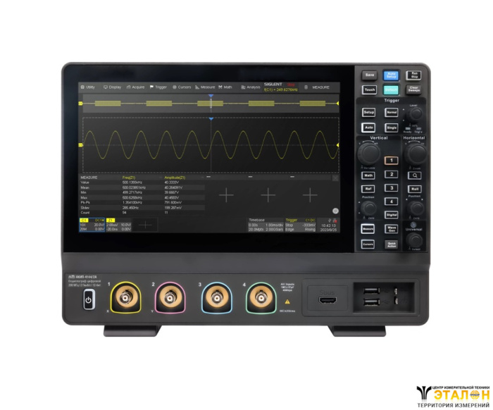 | Особенности | Осциллограф высокого разрешения, разрядность АЦП 12 бит. Высокая скорость обновления экрана до 500.000 осц./сек. Режим сегментированной памяти. Режим HISTORY. Интерполяция - Sin X/х, линейная. Автоматические (более 50-и параметров) и курсорные измерения. Математические функции, БФП (2 МБ). Режим «Поисковая машина/ Search» для поиска событий по условиям заданным пользователем. Синхронизация и декодирование сигналов, I2C, SPI, UART/RS232, CAN, LIN, CAN FD, FlexRay. Опция - логический анализатор 16 каналов. Опция - функциональный генератор до 25 МГц. Опция - измерение мощности и показателей качества электроэнергии (ПКЭ). |