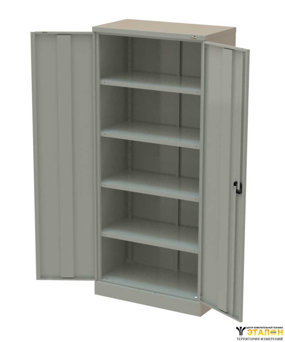 Металлический двухдверный шкаф с четырьмя полками предназначен для хранения документов в офисных или производственных помещениях