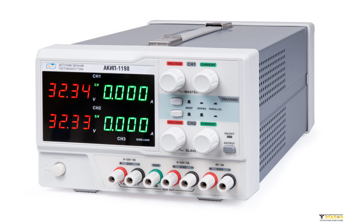 | Особенности | Дискретность установки 10 мВ/ 1 мА. LED индикатора, 4 разряда. Режим параллельного/ последовательного объединения, автотрекинг каналов (Кан1/ Кан2). Режимы стабилизации тока и напряжения (CC/CV). Защита от перенапряжения, перегрузки по току и перегрева (OVP/ OCP/ OTP). Низкий уровень шумов и пульсаций (<1 мкВскз, <3 мАскз). |