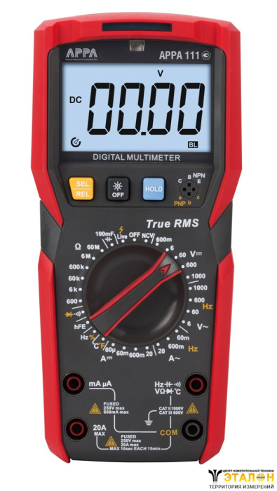 | Особенности | Измерение коэф. усиления транзисторов hFE (β) до 1000. Режим относительных измерений (REL). Бесконтактный детектор напряжения (NCV). Контактное измерение фазного/нейтрального провода (LIVE). Звуковая/визуальная сигнализация результатов измерений и опасного напряжения с помощью 3-х цветного LED-индикатора и зуммера. ЖК-дисплей с подсветкой (макс. «6000», 3 изм/с). Встроенный фонарик. Класс защиты IP67. Соответствие категории электробезопасности Кат III 600 В / Кат II 1000 В |