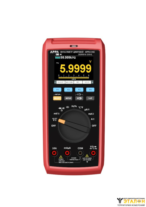 | Особенности | Рабочий диапазон частот 45 Гц …100 кГц (ACV), 45 Гц…10 кГц (ACA). Измерение температуры в диапазоне -50…+1000 °С. Вход «mA» для слаботочных измерений (0…600 мА). Регистрация МИН/ МАКС/ AVG (с метками времени), пиковых значений (Peak от 1 мс). Относительные измерения REL, фильтр НЧ (LPF), функция LoZ. Режим измерения петли тока (LOOP), диапазон «4-20 мА», индикация в %. Внутренний таймер, часы, календарь. Режим удержания показаний (HOLD). Цветной ЖКИ с подсветкой (макс. «60.000», 3 изм./с), граф. линейная шкала (61 элемент). Категория защиты 1000В кат III/600В кат IV. Питание 3 батареи 1,5В (тип ААА). Встроенный магнитный держатель, с/д фонарик подсветки. Сигнализация об ошибке коммутации изм. проводов на входе (Mis-Lead Alert) |