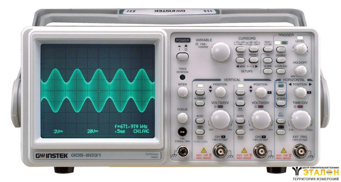| Особенности | Чувствительность 1 мВ/дел. Экранная графика. Курсорные измерения. 6-ти разрядный частотомер. Память на 10 установок органов управления. Растяжка развертки до х20. ТВ-синхронизация (построчная и покадровая). Режим развертки внешним сигналом (X-Y вход). Модуляция яркости луча (Z-вход). |