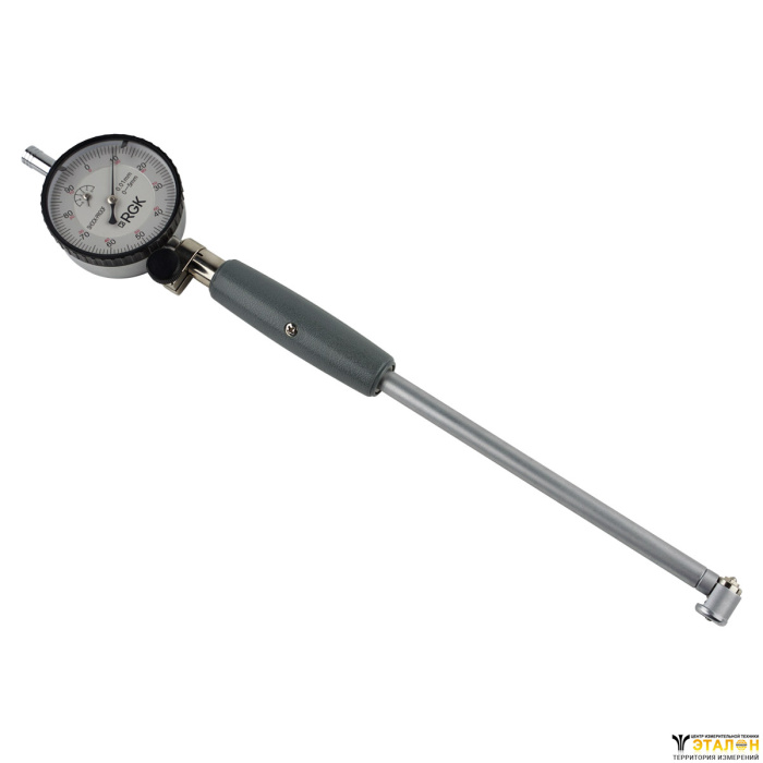 Конструкционно индикаторный нутромер RGK NI-50 представляет собой трубчатый корпус с внутренним механизмом и пластиковой термоизолирующей ручкой, в который установлена измерительная головка с приспособлением для самоцентрирования, а на противоположном конце крепится многооборотный индикатор часового типа с круговой шкалой, с ценой деления 0,01 мм, включенный в комплект поставки.