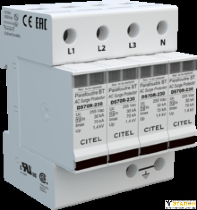 Многополюсный УЗИП DS70R предназначен для защиты однофазной, трёхфазной или трёхфазной+N сети переменного тока. Каждый полюс УЗИП соединяется между фазой и землей и нейтралью и землей.