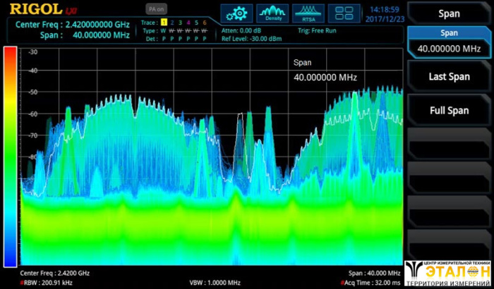 Опция RSA5000-B40 позволяет увеличить полосу анализа у анализаторов спектра Rigol серии RSA5000 в режиме RTSA до 40 МГц. Минимальная длительность для гарантированного захвата сигналов 100% POI - 7,45 мкс. Разрешение (для окна Kaiser) от 100 кГц до 3,21 МГц. Активируется программным кодом.
