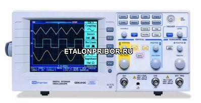 Цифровой осциллограф GDS-806S: Полоса пропускания 60 МГц; 2 канала; Коэффициент отклонения 2 мВ … 5 В / дел; Коэффициент развертки 1 нс … 10 с / дел; Частота дискретизации 100 Мвыб/с (эквив. до 25 Гвыб/с); Длина записи 125 К на канал; Маркерные и авто измерения (15 параметров); Частотомер 10 Гц … 60 МГц; Функция БПФ; Пиковый детектор (10 нс); Глубокая память (2 осциллограммы, 15 профилей); Выделение ТВ строки (PAL/ SECAM/ NTSC); Генератор калибровочного сигнала 1 … 100 кГц (скважность 5 … 95%); Монохромный ЖК-дисплей (320 х 240); Интерфейсы (1) - RS-232C, Опция: (2) - USB + LPT + Годен/не годен; Опция GPIB вместо (2); Масса 4,1 кг.