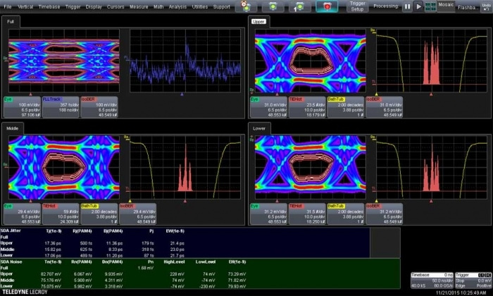Пакет полного анализа сигналов PAM4 (амплитудно-импульсная модуляция с четырьмя уровнями амплитуды). Программный пакет позволяет измерять параметры глазковой диаграммы, прогнозировать закрытие в зависимости от BER. Измерения джиттера, разделение джиттера на детерминированную Dj и случайную Rj составляющие, анализ шума, общего джиттера и визуализации шума, составить графики IsoBER