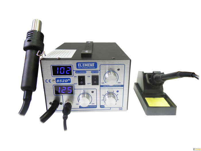 • Компрессорная комбинированная двухканальная паяльная станция ELEMENT 852D+ используется для работы с PLCC, SOP, SMD, QFP, SOIC, BGA, CHIP компонентами. Данная термовоздушная монтажно-демонтажная система с цифровой индикацией фактической температуры потока горячего воздуха отличается минимальной погрешностью при работе с различными материалами. Поставляется в комплекте с тремя сменными насадками для фена, что делает паяльную станцию универсальным устройством.