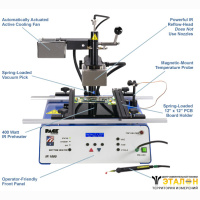 IR1000 - недорогая, гибкая инфракрасная станция для ремонта или монтажа BGA, QFP, SOIC, PLCC, MLF, LCCC, TSOP, QFN. Станция оснащена верхним инфракрасным нагревателем мощностью 500Вт, для которого не нужны сопла или диафрагмы. Станция идеально подойдет для ремонта или мелкосерийной сборки. Система не требует внешнего компьютера и довольно проста в управлении. Однако вы может воспользоваться специальным режимом обучения, который используется для пайки по термопрофилю. Возможно подключение к ПК для более точной настройки и наглядности процесса пайки.