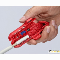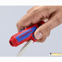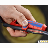 KNIPEX KN-169502SB стриппер предназначен для левшей для быстрого и точного удаления оболочки и изоляции с наиболее часто применяемых круглых проводов и проводов для сырых помещений (например, NYM от 3 x 1,5 мм2 до 5 x 2,5 мм2), дата-кабеля (например, витая пара) и коаксиального кабеля.