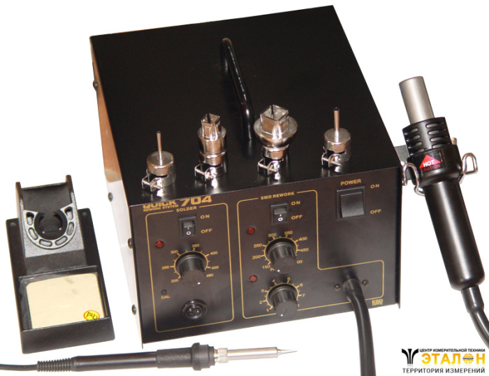 Двухканальная ремонтная станция Quick-704 ESD, состоящая из блоков управления монтажным паяльником и термоинструментом нагрева горячего воздуха. Независимая работа секций. Потребляемая мощность 380 Вт.