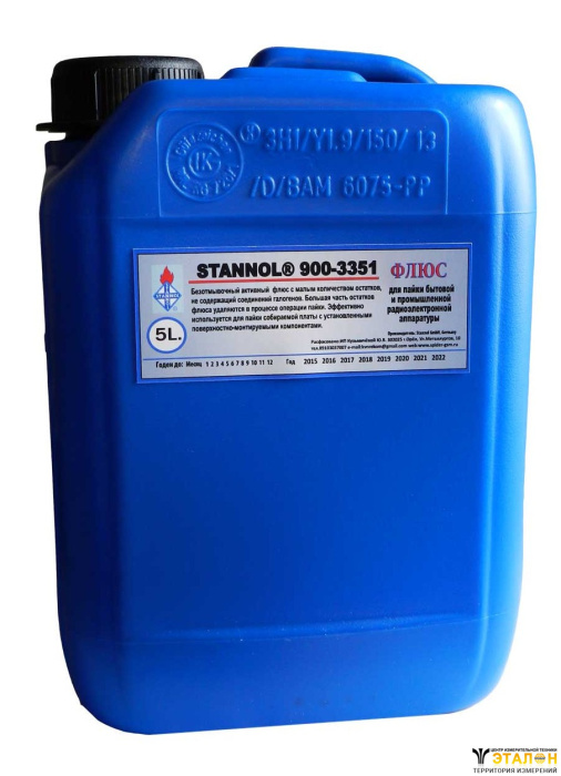Флюс Stannol 900-3351 — активный флюс с малым количеством остатков, который эффективно используется для пайки нижней стороны собираемой платы, с установленными поверхностно-монтируемыми компонентами, двойной волной припоя. Специально подобранный состав флюса Stannol 900-3351 обеспечивает сохранение достаточного количества флюса после прохождения первой волны припоя. Это способствует удалению избытков припоя и формированию идеальной галтели в местах пайки.