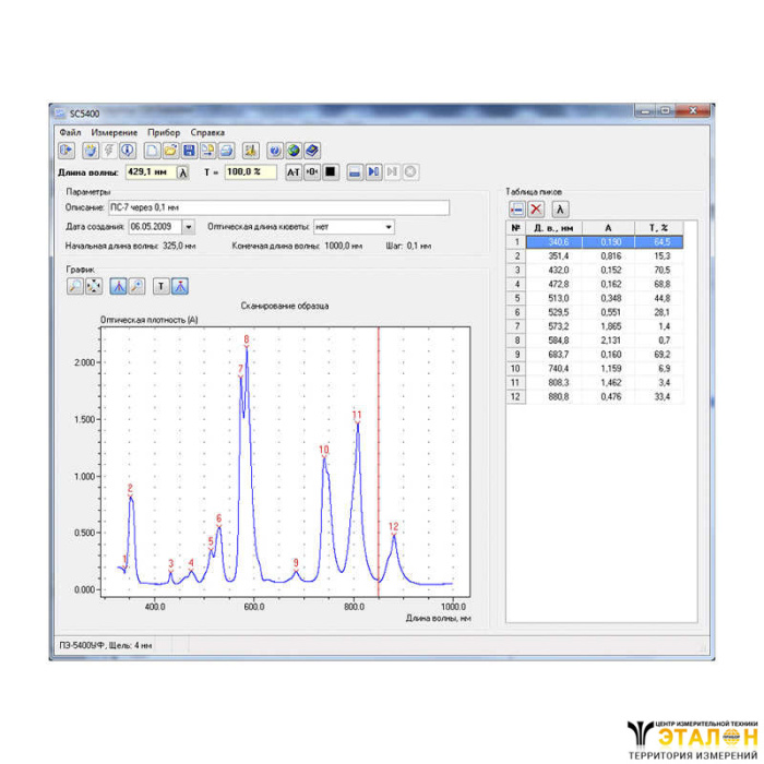 Системные требования IBM-совместимый персональный компьютер с установленной операционной системой Windows XP, Windows Vista или Windows 7. Видеокарта, обеспечивающая разрешение экрана не менее 1024 на 768 точек, при качестве цветопередачи 16 или выше бит (предпочтительно 1280 на 1024 точек) и монитор, поддерживающий данное разрешение. Два порта USB 1.1 или 2.0 (для подключения прибора и электронного ключа). Не менее 10 МБ свободного дискового пространства. ФУНКЦИИ Управление прибором Реализованы следующие возможности: Установка заданной длины волны Компенсация темнового тока Калибровка 0A/100%T Отображение установленной длины волны Отображение текущего значения оптической плотности или пропускания Сканирование Сканирование оптической плотности образца по длине волны в заданном диапазоне длин волн с заданным шагом (от 1 до 10,0 нм). Определение пиков В программе реализован алгоритм определение пиков спектра - максимумов оптической плотности или минимумов пропускания, в зависимости от выбранного режима отображения спектра. Данный алгоритм эффективно работает только с относительно гладкими спектрами. Имеется возможность ручного редактирования таблицы пиков путем удаления и добавления пиков. Печать протоколов Программа предоставляет возможность распечатки протоколов снятия спектра и нахождения пиков. Сохранение и загрузка В программе имеется возможность сохранить спектр в файл. В дальнейшем его можно будет загрузить из файла и использовать для нахождения пиков, проведения новых измерений или печати протокола. Экспорт Реализованная в программе функция экспорта предназначена для сохранения таблицы данных спектра или таблицы пиков в формате Microsoft Excel™.