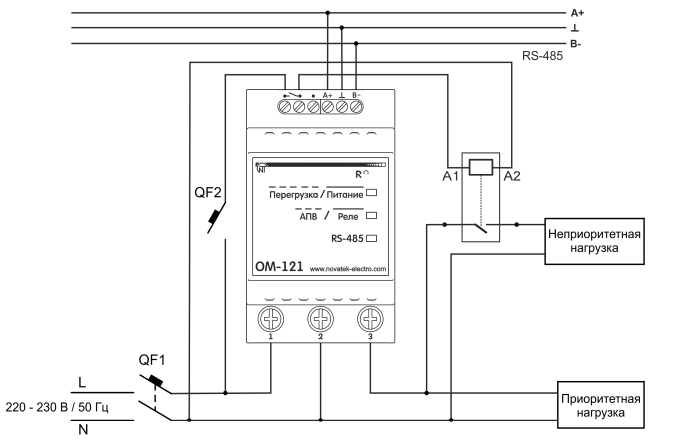 Предназначен для контроля напряжения, активной/реактивной/полной мощности, тока потребляемого нагрузкой и последующей передачей информации по протоколу Modbus RTU. Подключение нагрузки на клеммы прибора для измерения до 63 А.