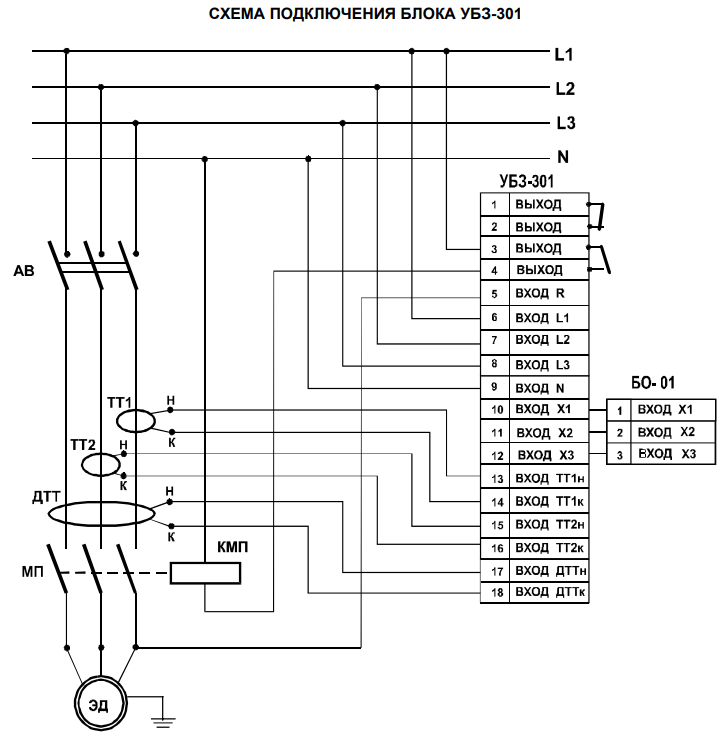 Универсальный блок защиты электродвигателей УБЗ-301 предназначен для постоянного контроля параметров сетевого напряжения и действующих значений фазных/линейных токов трехфазного электрооборудования 380 В/50 Гц, в первую очередь, асинхронных электродвигателей (ЭД), мощностью от 2,5 кВт до 315 кВт, в том числе и в сетях с изолированной нейтралью.