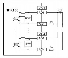 Выходные элементы типа Р контроллера с внешними цепями защиты при активной нагрузке, Rн – пользовательская нагрузка (двигатель, нагреватель, контактор и т.д.)