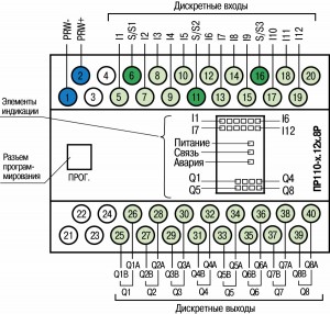 Расположение контактов и элементов индикации в приборах ПР110-ххх.12Дх.8Р-х