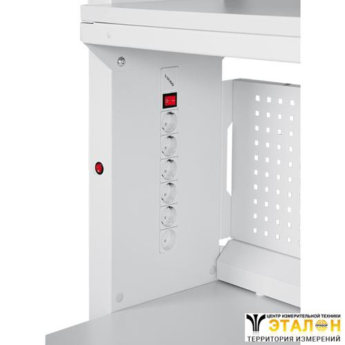 Стол рабочий ГМ-18-7/ЛESD поставляется в комплекте: стол рабочий с боковыми стойками, основная полка, верхнее освещение, верхняя и нижняя перфопанели и боковой энергоблок. Быстросъемные боковые панели обеспечивают удобство доступа к внутренним коммуникациям. Возможна поставка в 2 модификациях – с правым (ПР в артикуле) или левым (Л в артикуле) энергоболоком в боковой панели. Встроенный энергоблок имеет 6 розеток и кнопку выключения.