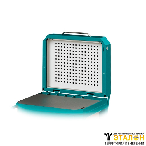 Перфорированный экран-крышка ПФП/ВТМ предназначен для размещения инструмента и дополнительных принадлежностей над рабочей зоной с помощью держателей. Экран-крышка крепится на бортик передвижной мобильной станции петлями при помощи болтового соединения и позволяет при необходимости закрыть рабочую зону передвижной станции на ключ.