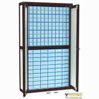 Полка для хранения комплектующих с блоками ячеек позволяют размещать радиодетали и мелкие предметы. Односторонее размещение ячеек: 3 блока АТР-9352 (60 ячеек 85х120х40 мм), 1 блок АТР-9354 (40 ячеек 40х120х40 мм), 2 блока АТР-9358 (160 ячеек 85х120х20 мм). Полка закрывается двумя стеклянными запираемыми дверцами. Цвет каркаса алюминиевого профиля - серый (RAL 9006), цвет ДСП - белый. Габаритные размеры 66*18*110 см.