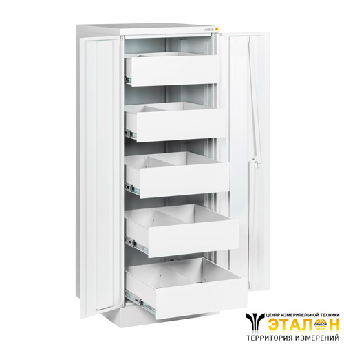 Шкаф для инструмента ШДИ-1 оснащен 5 выдвигающимися ящиками размером 460/2×130×550 мм, нагрузка на каждый ящик — до 30 кг. Как и остальные шкафы серии, металлический двухдверный шкаф ШДИ-1 оснащен замком типа CAM LOCK с тягами, секретность 2000 комбинаций.