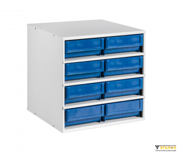 Тумба-сегмент поворотной стойки СП-01/C-2, состоит из металлической тумбы 395 × 400 × 400 мм с 8 широкими пластиковыми кейсами, размещенными на 4 полках. Вес 9,5 кг.