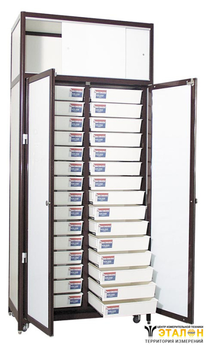 Стойка комплектовочная 90 х 50 х 202 см. Цвет алюминиевого каркаса - коричневый (RAL-8017), цвет ДСП - белый. 30 ящиков 33 x 40 x 8 см в два ряда. 2 дверцы из полупрозрачного стекла с замком. Полка 84 x 44 см с раздвижными дверцами из оргстекла. 4 колеса, 4 винтовые ножки.