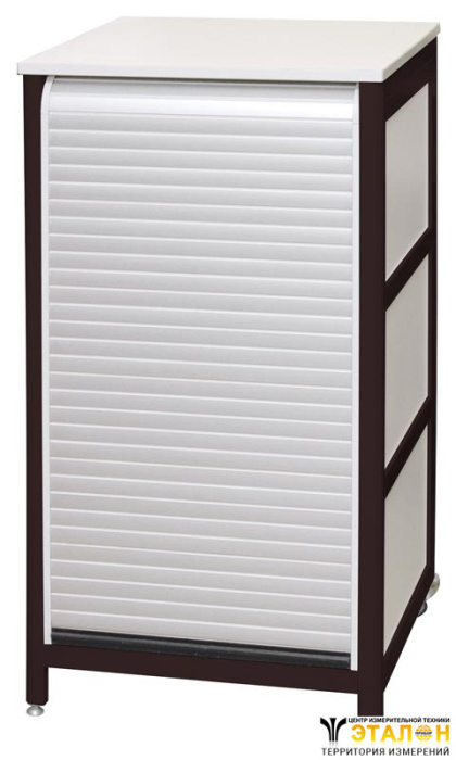 Стойка для хранения комплектующих элементов или инструмента. Цвет каркаса алюминиевого профиля - коричневый (RAL 9006), цвет ДСП - белый. 10 выдвижных ящиков (33 х 40 х 8 см), запираемые шторки-жалюзи. Габаритные размеры: (ш х г х в) 50 х 52 х 118 см.