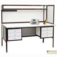 Стол инженера/менеджера АКТАКОМ АРМ-4450 позволяет рационально и удобно организовать рабочее место для эффективной работы. Цвет алюминиевого каркаса - коричневый (RAL-8017), цвет ДСП - белый. Столешница размером 150 x 80 см обладает высокой ударопрочностью, устойчивостью к истиранию, воздействию химикатов (растворителей и т.д.), а также противостоит воздействию температур до +230 °C. Расстояние от столешницы до пола 750 мм с регулировкой опорами +10 мм. У стола АРМ-4450 имеется перегородка высотой 60 см правосторонняя (левосторонняя - по заказу) и одна полка 150x20 см над столешницей. Также есть полка 150х30 см с задней стенкой под столешницей. В стандартной модификации полки фиксированы по высоте. Для освещения рабочего места стол инженера/менеджера АРМ-4450 оборудован двумя светодиодными светильниками по 10 Вт. Для электропитания приборов и другого оборудования предусмотрен блок из 8 розеток с выключателем. Высота 134 см.